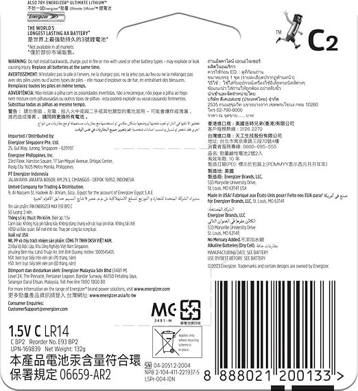 Power your high-drain devices with Energizer MAX C alkaline batteries, delivering dependable 1.5V performance, long-lasting energy, and up to 10-year shelf life—ideal for flashlights, toys, and everyday electronics.