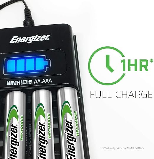 Extremely compact and light Energizer Rechargeable Mini-Charger, which provides you with reliable power at home and on the way. This practical device charges 1 or 2 AA or AAA NiMH batteries in 8 hours*. Easy to use: Simply insert the batteries, plug the device into the wall socket and you have charged batteries at hand if necessary. Once your batteries are fully charged, the display lights up green. ideal for frequently used devices, such as remote controls, computer mice and toys. Maximize battery performance with Energizer’s charging efficiency.