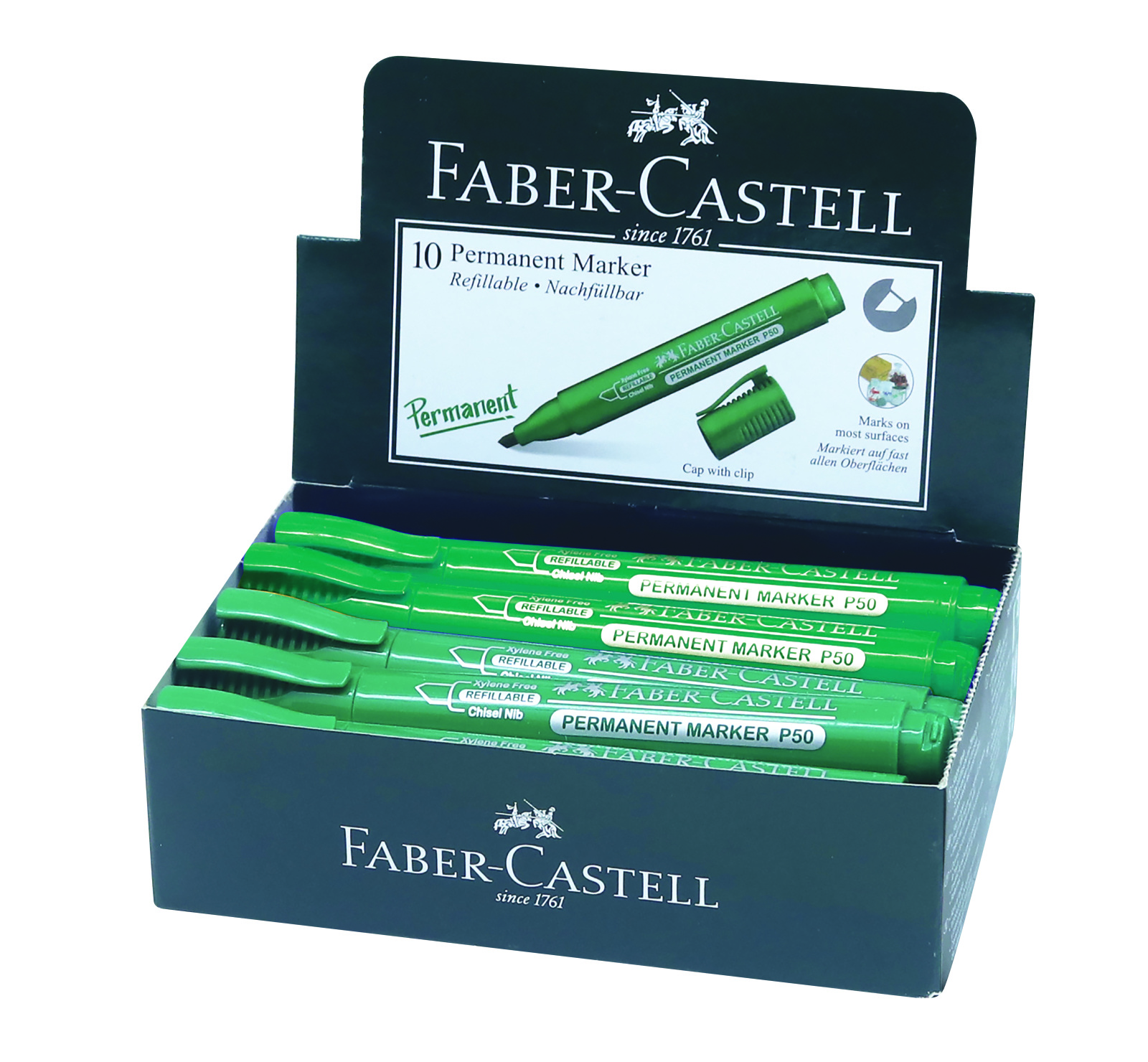Faber-Castell P50 Permanent Marker Create great impressions on surface with the marker. The optimized technology offers low odor ink and the color won’t fade away easily. The high-quality ink dries quickly on all surfaces. The ultra-durable tip produces sleek and vibrant writings.