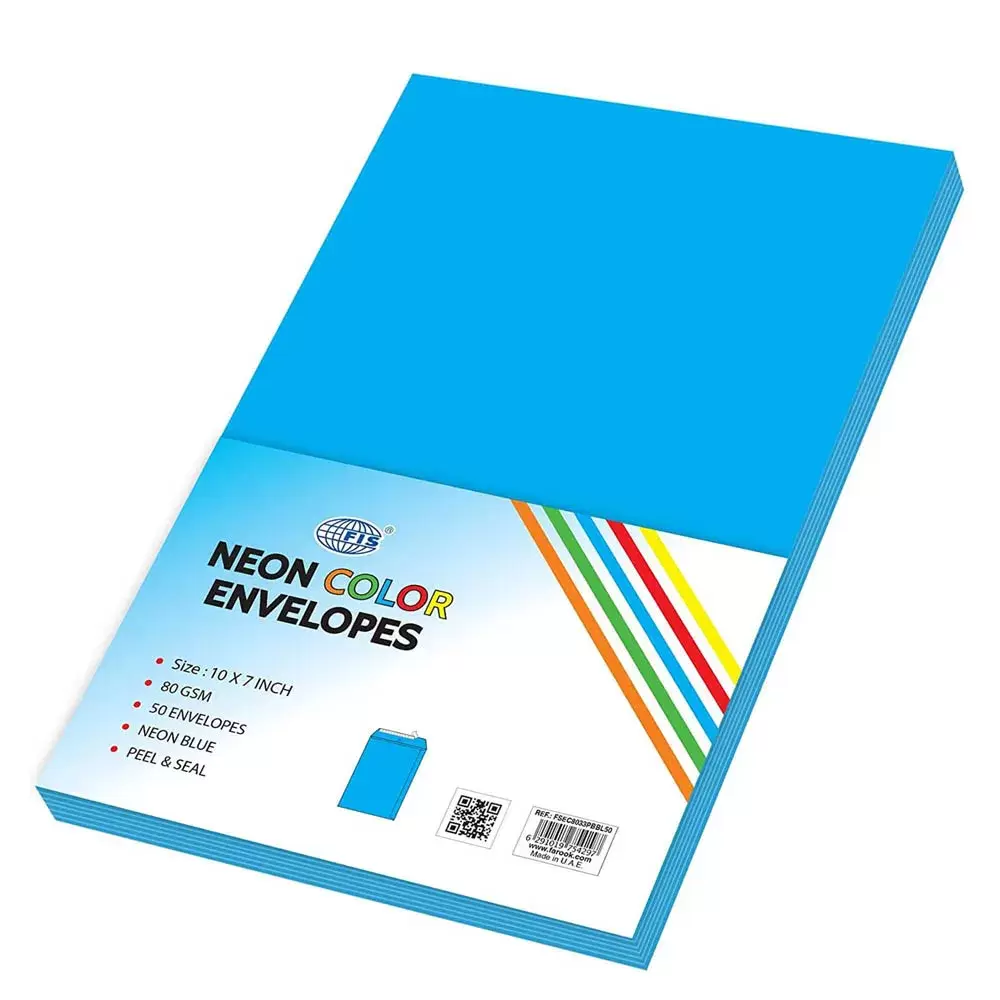 FIS Color Envelopes Peel & Seal, Neon Colors, Pack of 50 Pcs. Blue Color, 10 x 7 Inch, 80 GSM – FSEC8033PBBL50
