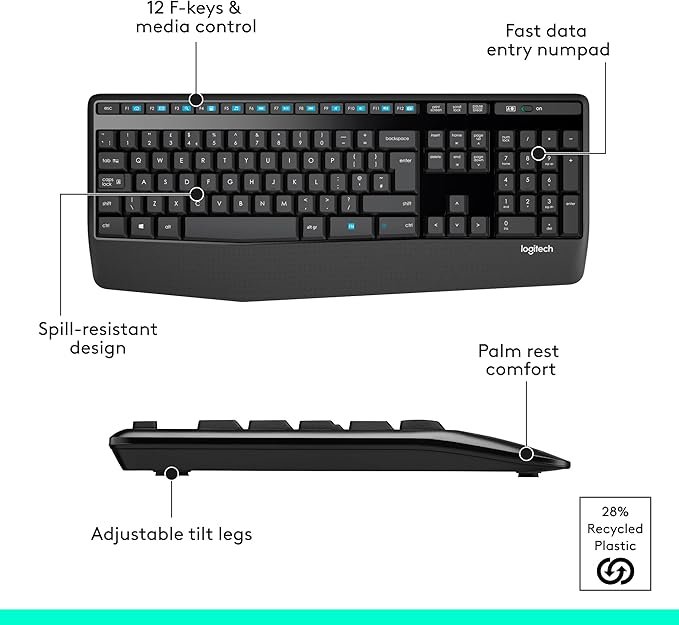 Comfortable Logitech MK345 wireless keyboard and mouse combo with full-size layout, palm rest, long battery life, and reliable performance for everyday use.