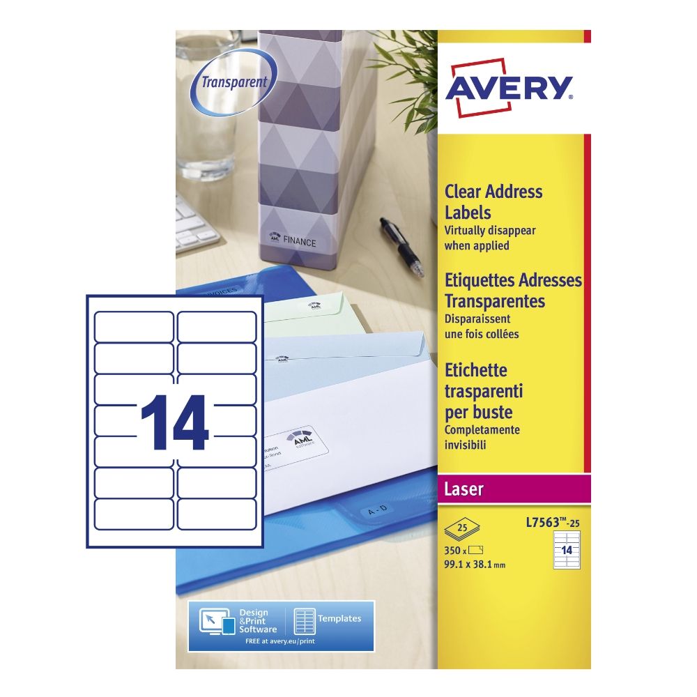L7563 - AVERY TRANSPARENT ADDRESS LABEL, 99.1X38.1MM, 14 LABELS PER SHEET, 25 SHEETS IN A PACK